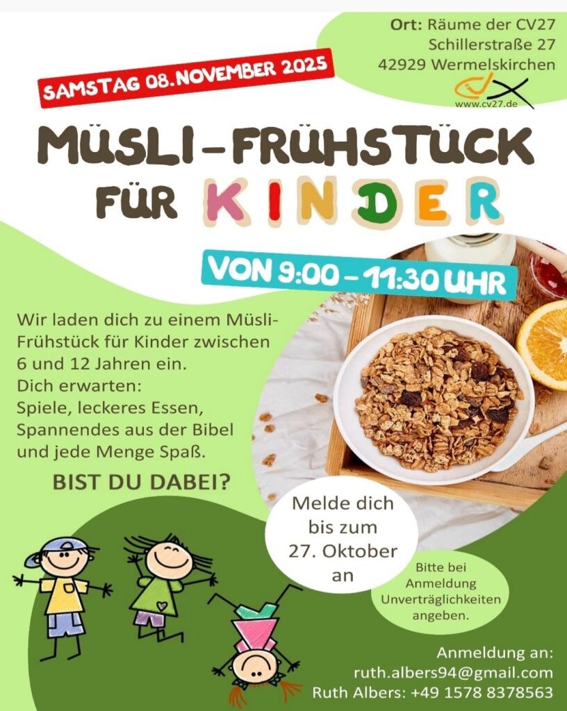 Wir laden dich zu einem Müsli-Frühstück für Kinder zwischen 6 und 12 Jahren ein. Dich erwarten: